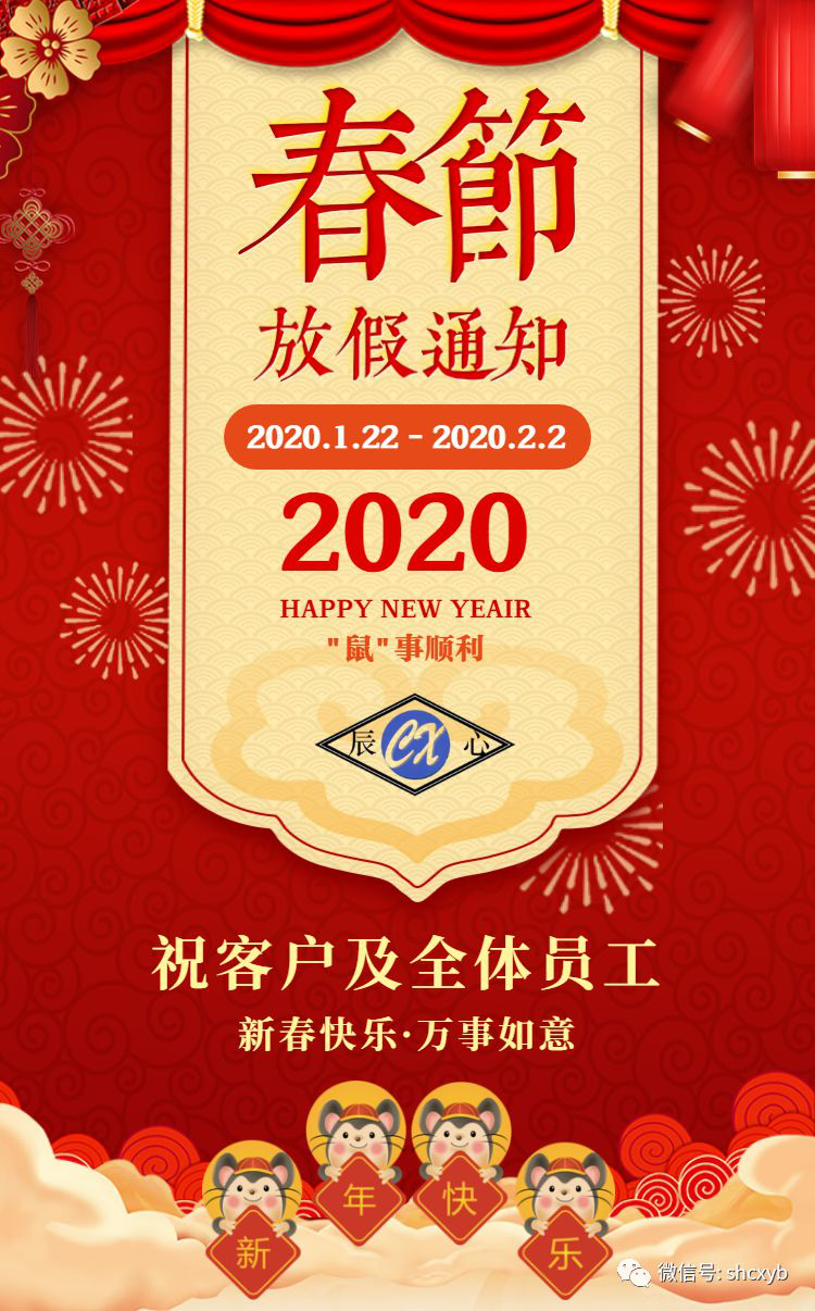 自2020年1月22日(rì)至2020年2月2日為我公司春節(jiē)放假(jiǎ)期,屆(jiè)時將停止發貨, 所有訂(dìng)單都(dōu)將在春(chūn)節假期回來(lái)的第一(yī)天(2月3日)按訂單順序陸續發出給 您帶來的不便,敬請諒(liàng)解!